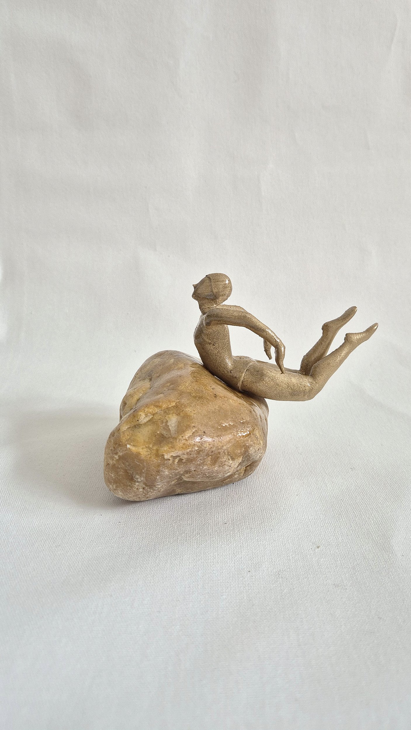 dimensão da obra aproximada 10x10x10cm; pedra de rio com escultura impressa com tecnologia 3D com acabamento dourado