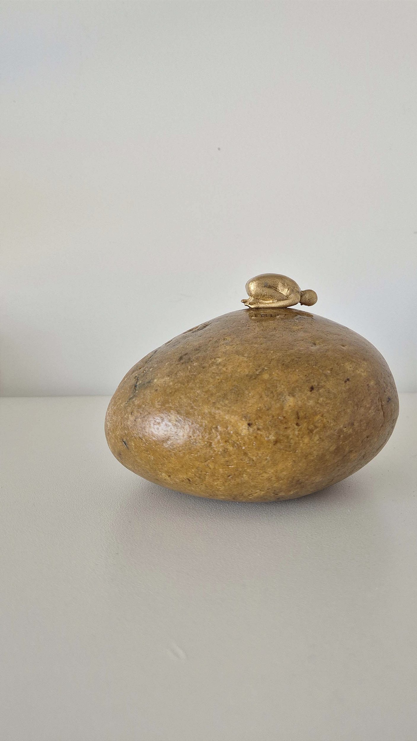 dimensão da obra 11x10x7cm; pedra de rio com escultura impressa com tecnologia 3D com acabamento texturizado musgo e fio de ouro