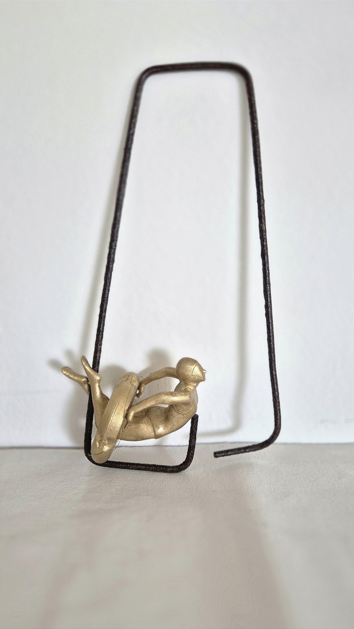 As esculturas partem de arames de concreto armado — materiais usados para erguer estruturas — e ressignificam esses restos da construção civil como molduras do gesto humano, do instante poético, da presença.