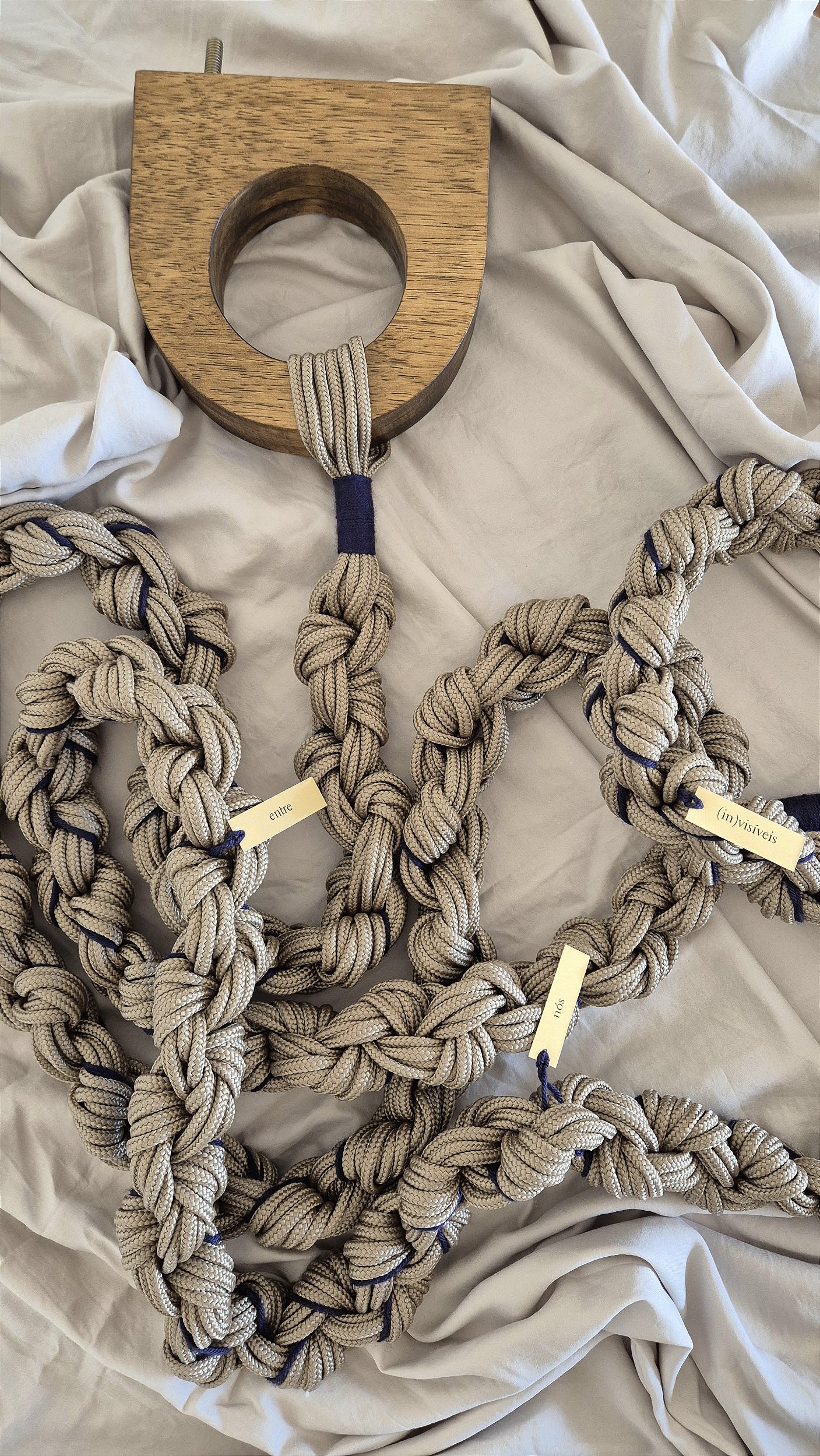 Dividida em três linhas - Linhas, Nós e Elos - a série explora a conexão entre o material e a reflexão, onde cada elemento carrega um simbolismo próprio. Os fios representam trajetórias e continuidades, os nós falam de laços e tensões, enquanto os elos evocam união e permanência.