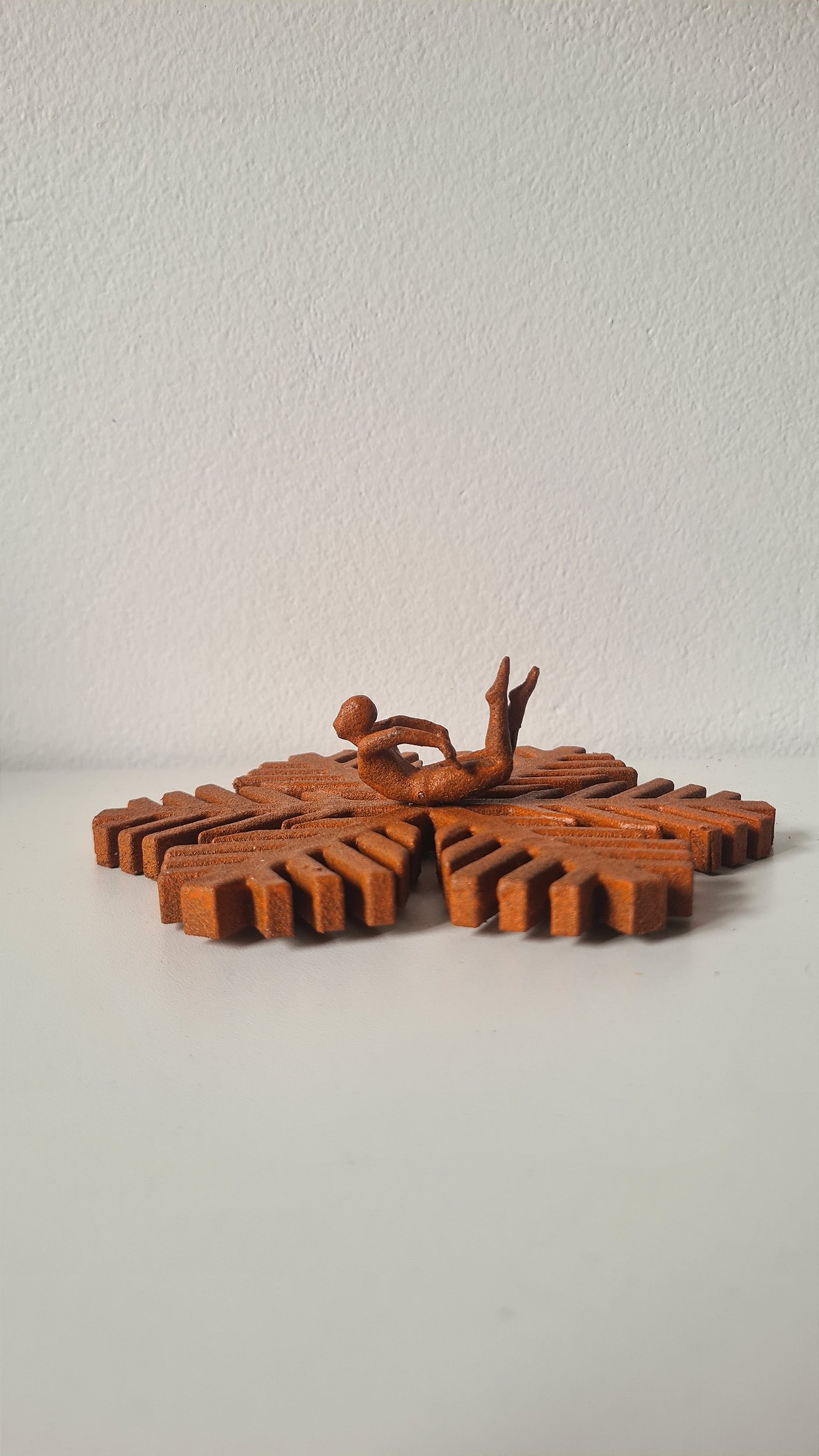 obra composta de uma escultura, e poesia visual, impressa em 3D, com acabamento em cortén, e dentro de uma caixa de acrílico, com fundo branco leitoso, de 20x20x7cm. Esta obra faz parte da série Fractais: O Universo expande em nós.