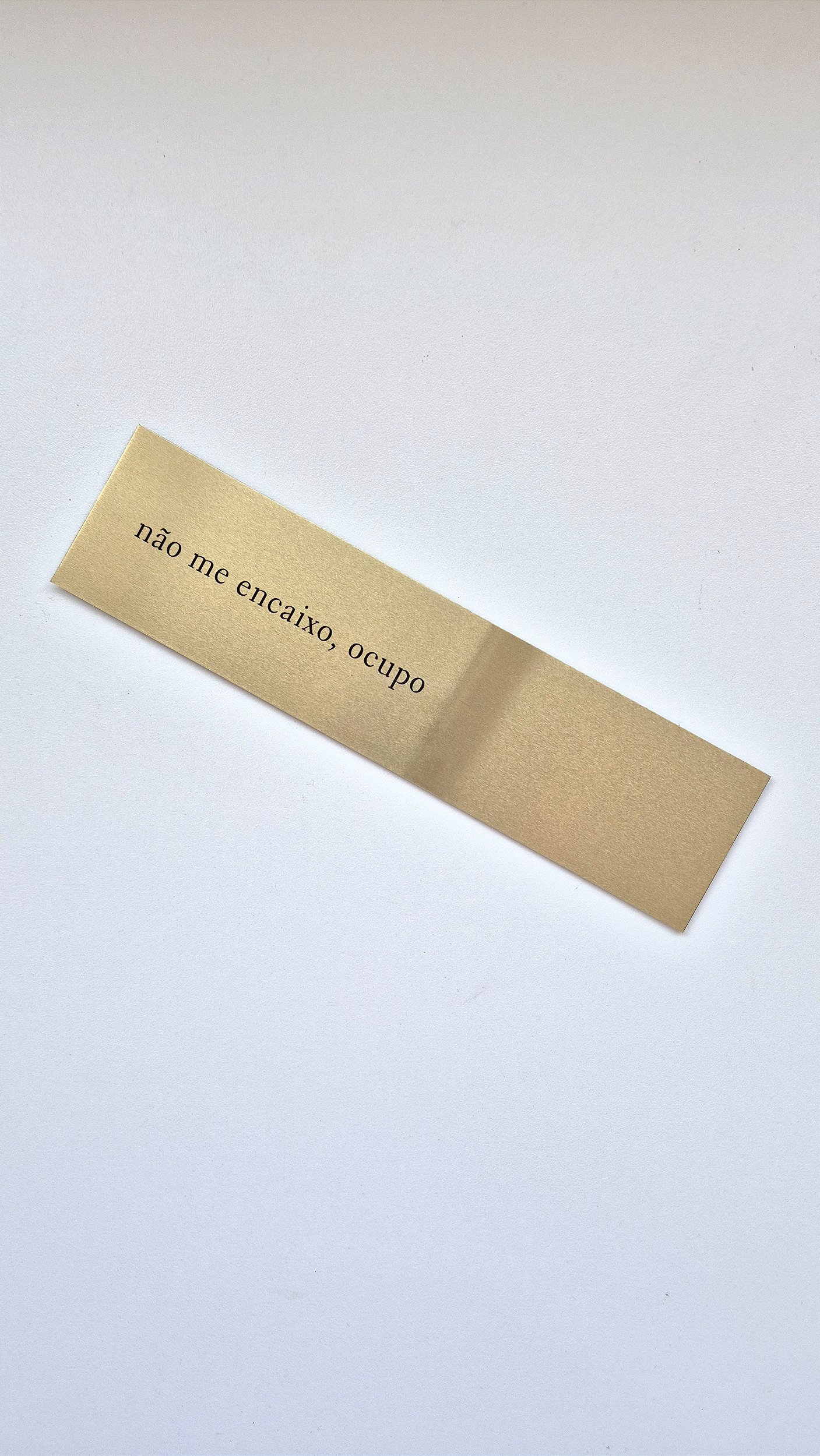 lâmina de alumínio com fundo dourado e impressão de poesia em preto.