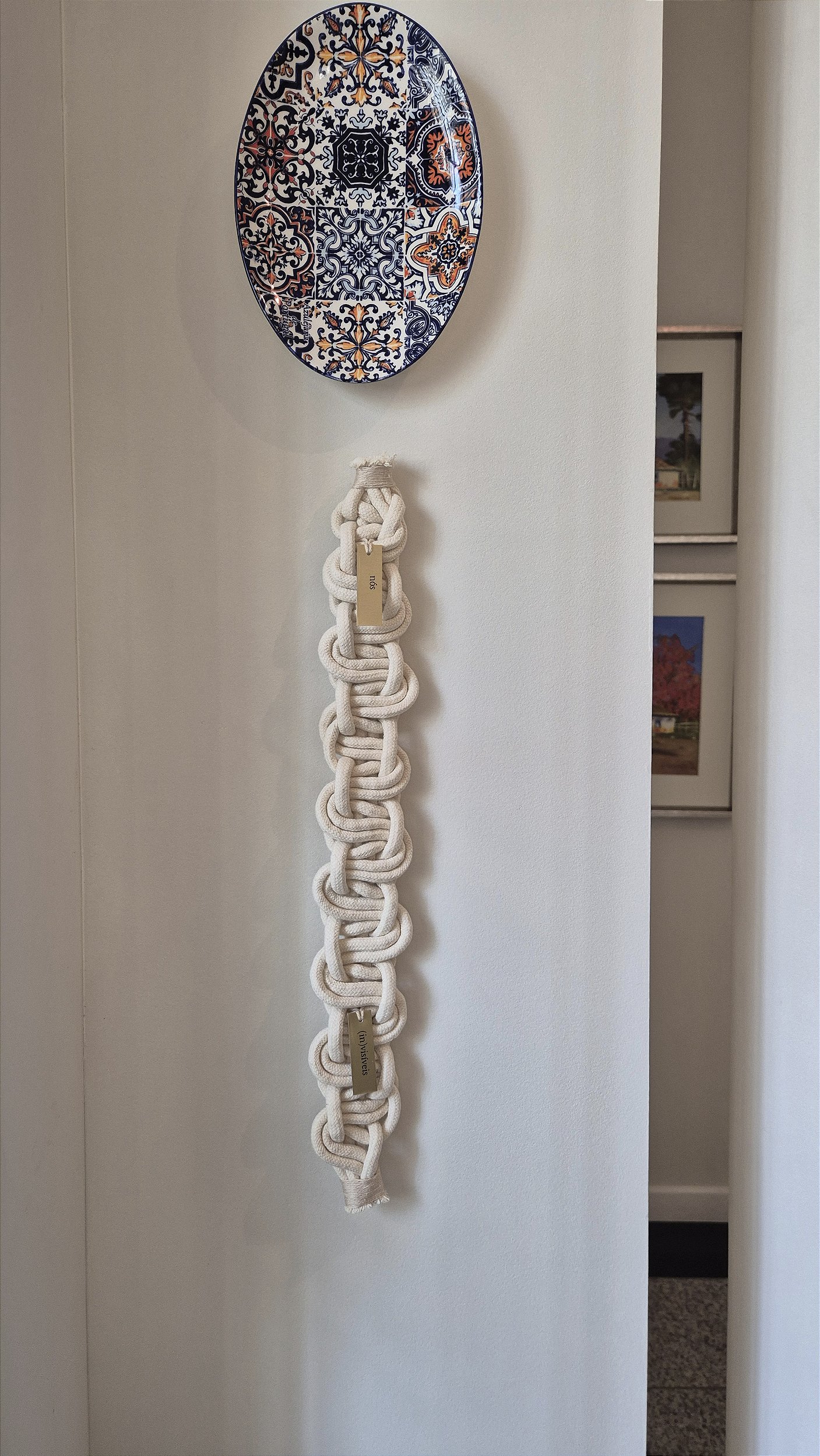 diferentes modelos de nós, em corda de algodão cru, para você apoiar sobre estantes e mesas de centro, ou pendurar na parede. Obras versáteis que compõe diferentes ambientes e entre si também. Nós colecionáveis cheios de poesia em pequenas placas metálicas douradas. Cada nó tem 40cm de comprimento.