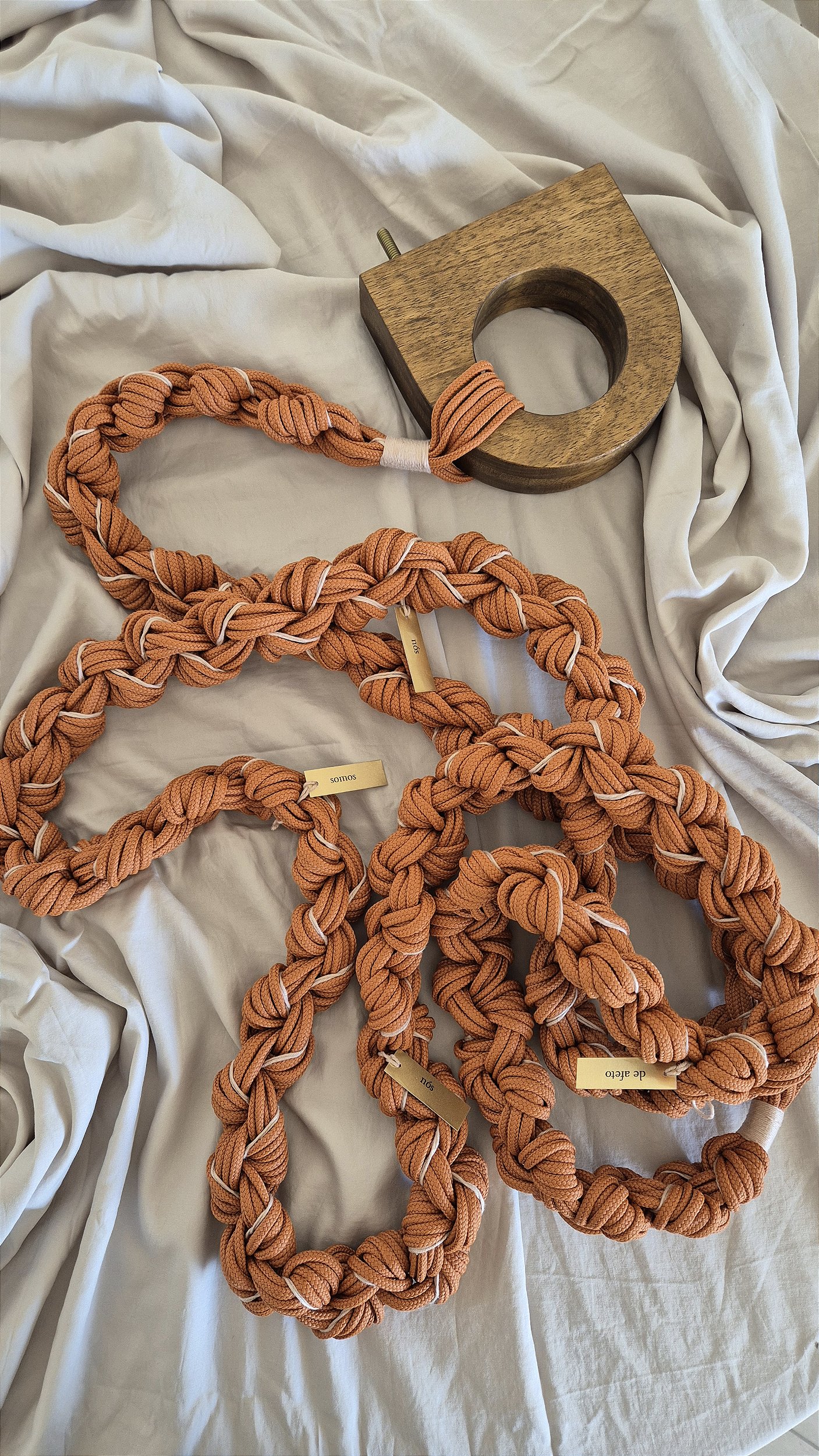Dividida em três linhas - Linhas, Nós e Elos - a série explora a conexão entre o material e a reflexão, onde cada elemento carrega um simbolismo próprio. Os fios representam trajetórias e continuidades, os nós falam de laços e tensões, enquanto os elos evocam união e permanência.
