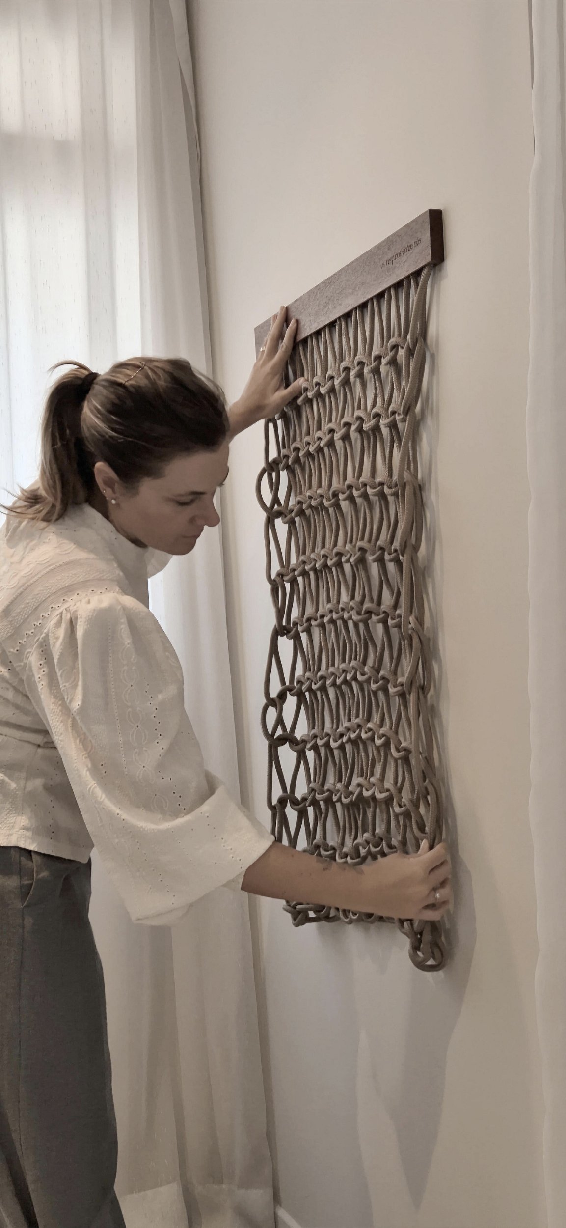 uma barra de madeira que carrega uma poesia, também sustenta um painel de nós feito de cordas de fio náutico. A obra em seu tamanho total tem 70x100cm, sendo a barra de 70x4cm. Ela é fixada na parede através de um L metálico que acompanha a obra.