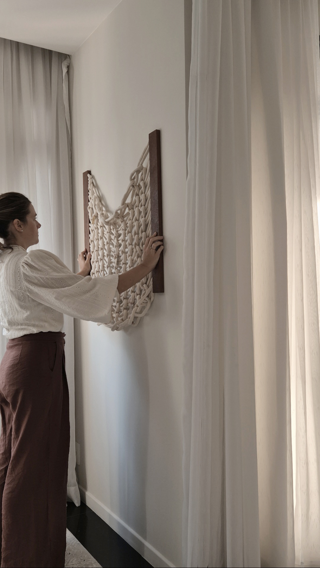 A série Entre Nós nasce do encontro e da soma entre duas artistas, Kalina Juzwiak, a kaju, e Vitória Monteiro, a Gretta, um diálogo tramado em matérias, formas e palavras. Cada obra é um entrelaçamento de ideias, memórias e sentimentos, construído a partir de fios, cordas, argolas e pedaços de madeira.
