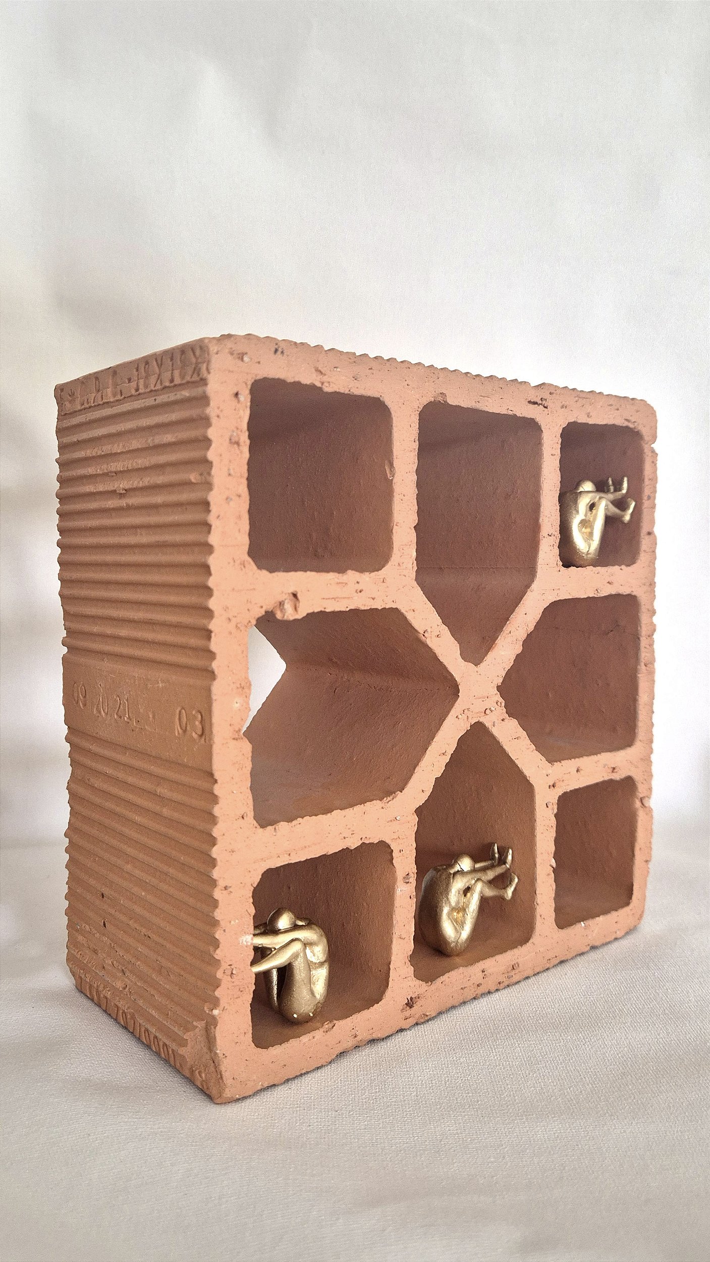 obra composta de tiljolo vazado de construção e esculturas feitas a partir da impressão 3D com acabamento manual em dourado