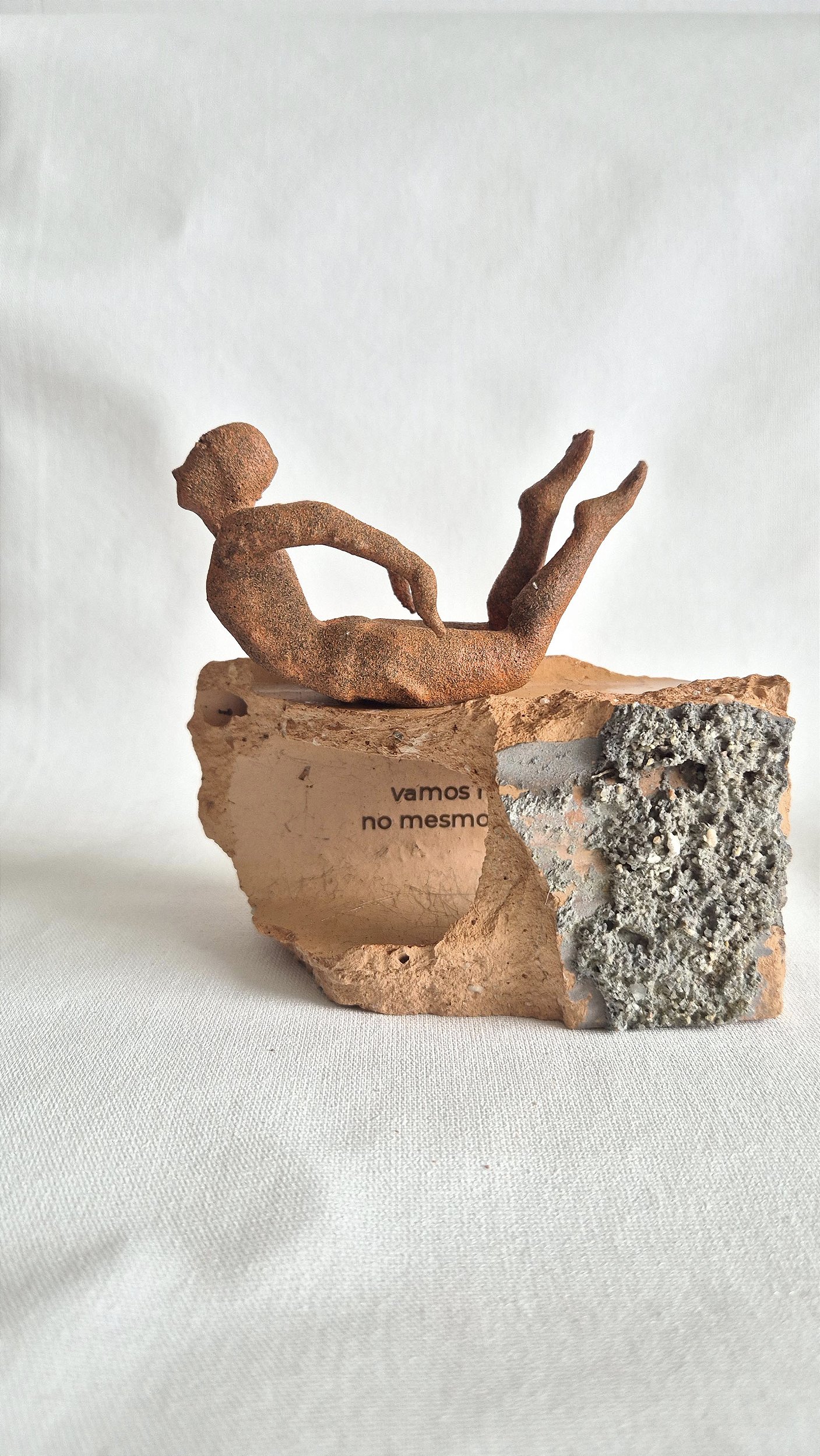 Obra que faz parte da série TELHA, TETO, AFETO. Uma série de obras originais e únicas, criadas a partir da ressignificação de matérias encontradas nas areias do litoral do Sul do Brasil. E esculturas que, em seus processos de produção, apresentaram algum defeito. Uma série que fala de reaproveitamento, se torna um ato de transformar e provocar uma nova perspectiva sobre descartes e pedaçoes de lares que são trazidos pelos mares.