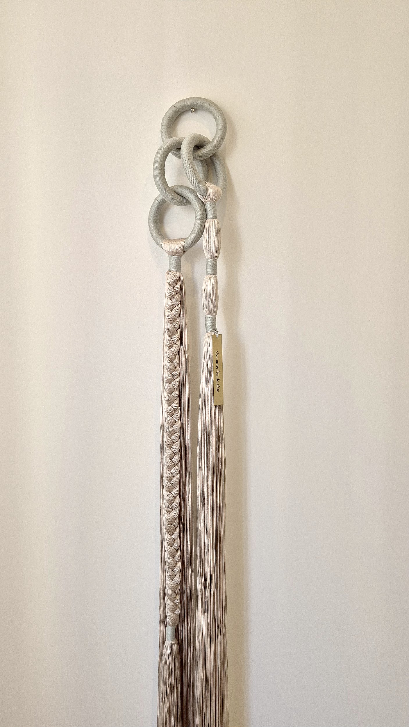 uma obra de 1,35 metros de comprimento, criada com a fluidez dos fios, de 100%acrilico. Argolas revestidas com fios de 100% algodão de cores complementares à palheta da coleção são o sustento da obra. Acompanha um gancho de forma circular de madeira na cor whiskey. Na obra você encontra placas metálicas, douradas, com poesias que completam a narrativa visual.